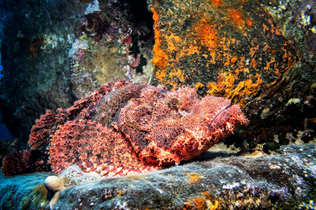 ハナミノカサゴはダイナミックな見た目が特徴ですが、毒トゲを持っています。刺されると激痛が走り、重篤な場合は呼吸困難や意識障害などを起こすこともあります。刺された場合は火傷しない程度のお湯に30分ほどつけて毒を中和しましょう。症状が重い場合は病院に行きましょう。